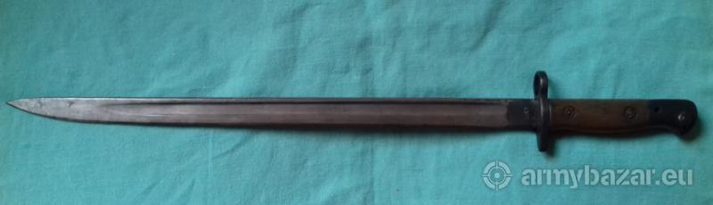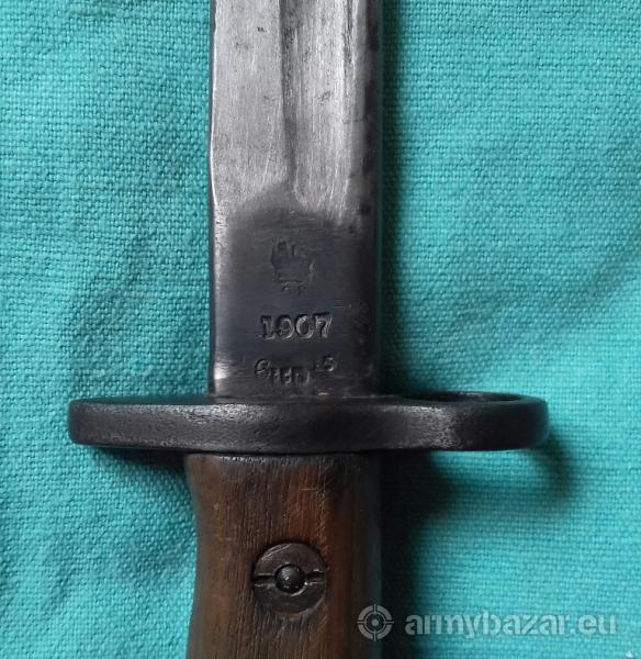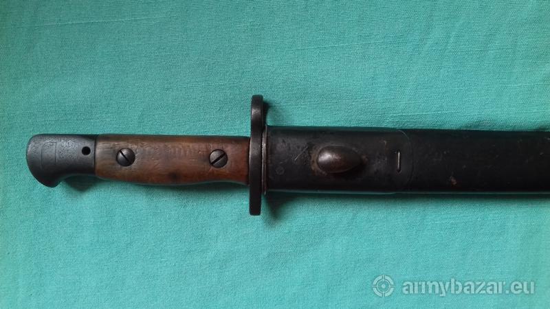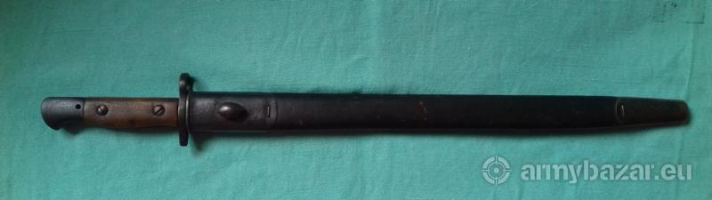 Popis: Prodám bajonet k pušce Enfield v pěkném stavu, pochva též velmi zachovalá, nepoškozená. Ražen rokem 1907.