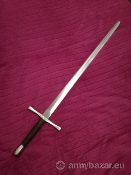 Popis: Prodám meč, jedenapůruční vlastní výroby, celková délka 1055mm, těžiště 80mm před záštitou. Materiál pružinová ocel, ostra čepel, rukojet z kůže.