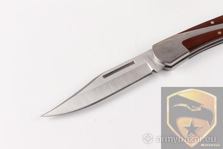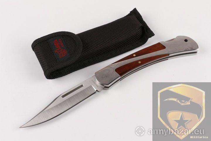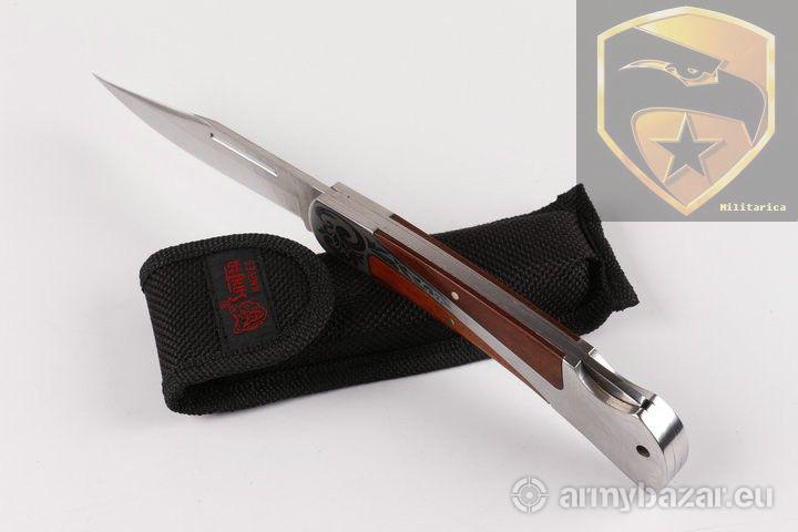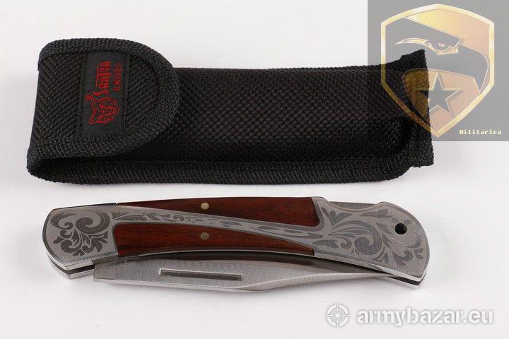 Popis: Nôž s ornamentami na kovových častiach rukoväte. Celková dĺžka 22,2 cm, uzavretý 12,6 cm. Tvrdosť 56 HRC, hrúbka čepele 0,29 cm, váha 180 g. Cena 17 €, poštovné pri dobierke 2,50 €.
